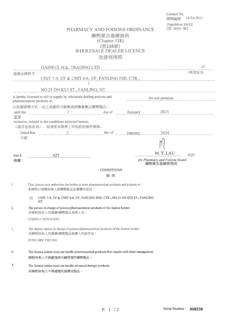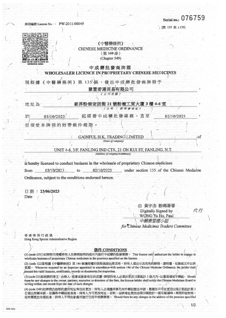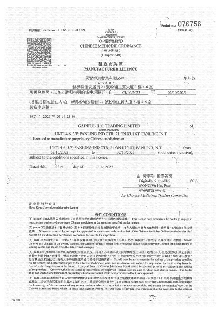 所有謝太公產品均生產自香港衞生署認可及監管的藥廠,並獲香港中醫藥管理委員會簽發製造商牌照、中成藥批發商牌照、 及由香港衞生署按藥劑業及毒藥條例簽發批發商牌照。多年來一直秉持最高生產規格,除確保所有謝太公產品安全、優質之 外,亦為消費者帶來可靠、有效的醫藥保健品。