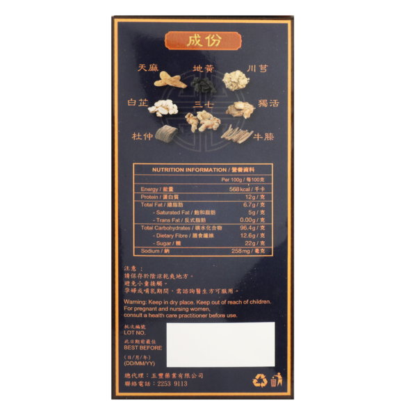 採用天然有效的草本配方,關注因血虛、腎氣不足、肝氣鬱結而容易引致的頭頸酸痛、氣血瘀阻、腰腿酸痛的問題。關注老人、婦女月經後、生產後常見的頭痛、手腳冰冷、頭暈作悶問題。本品採用了天然草藥製劑提煉而成,不含西藥成份,安全可靠。