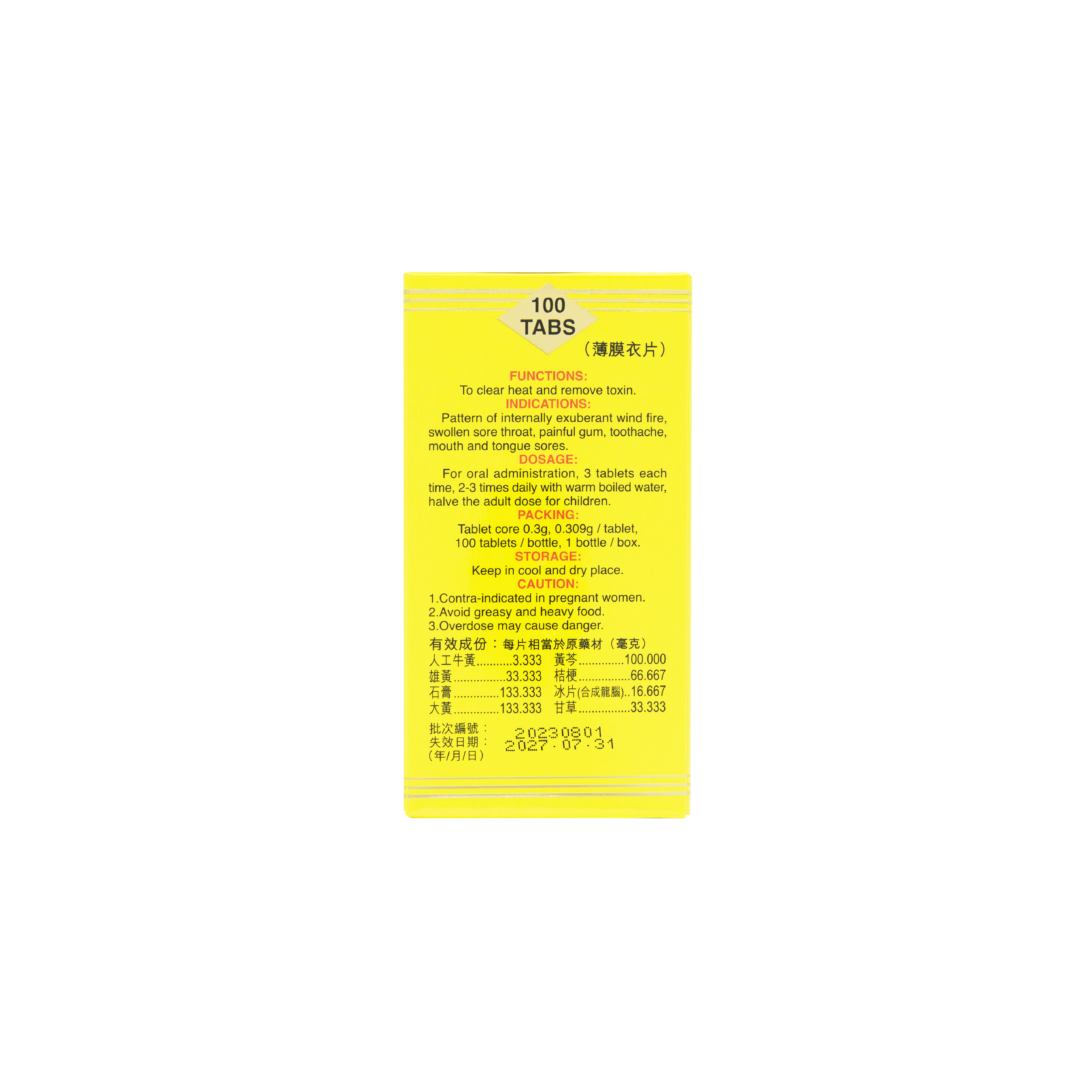 用於火熱內盛、咽喉腫痛、牙齦腫痛、風火牙痛、口舌生瘡。